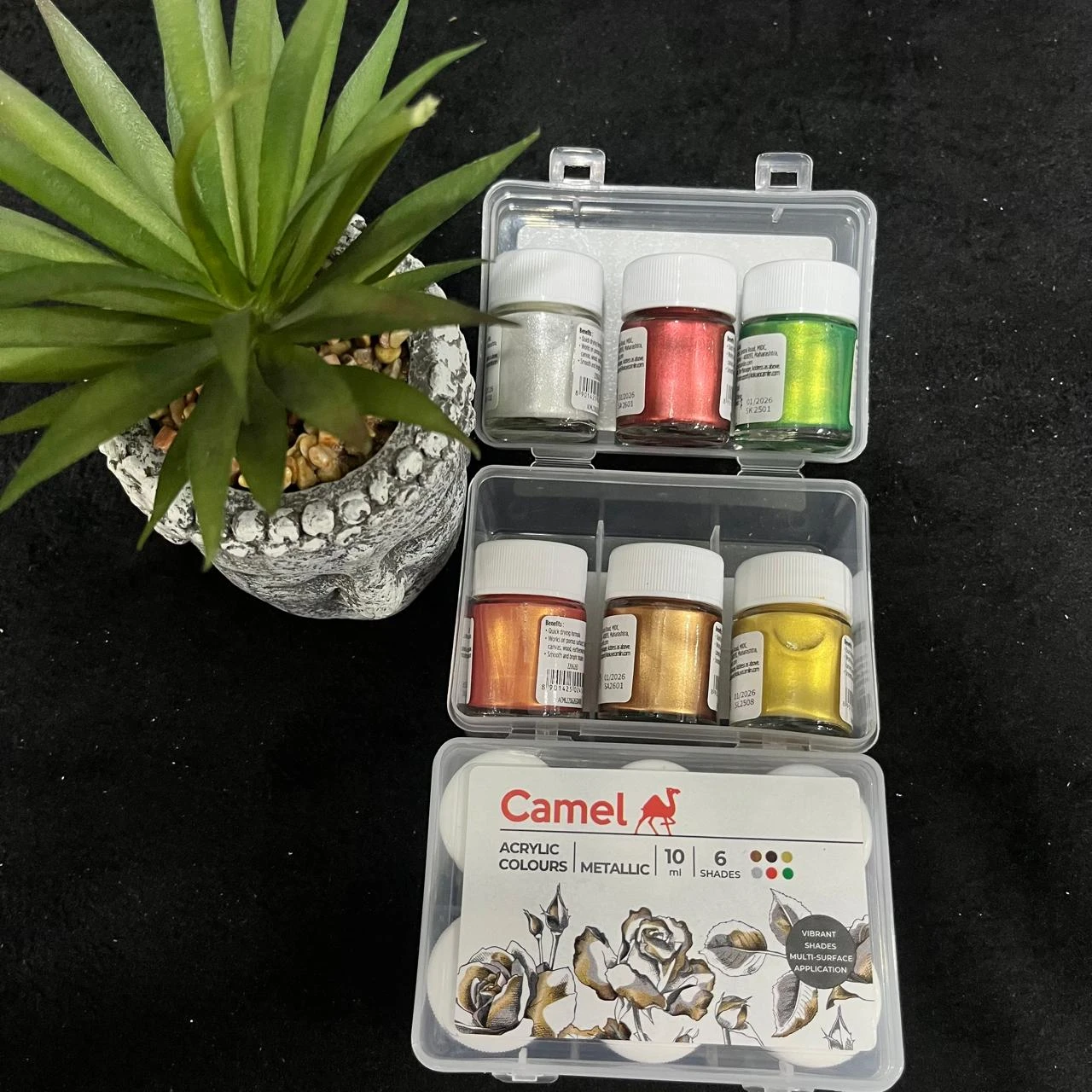 Camel Metallic Acrylic Colours Set – 6 Shades (10ml Each) with Plastic Storage Box | Metallic Paint for Art & Craft
